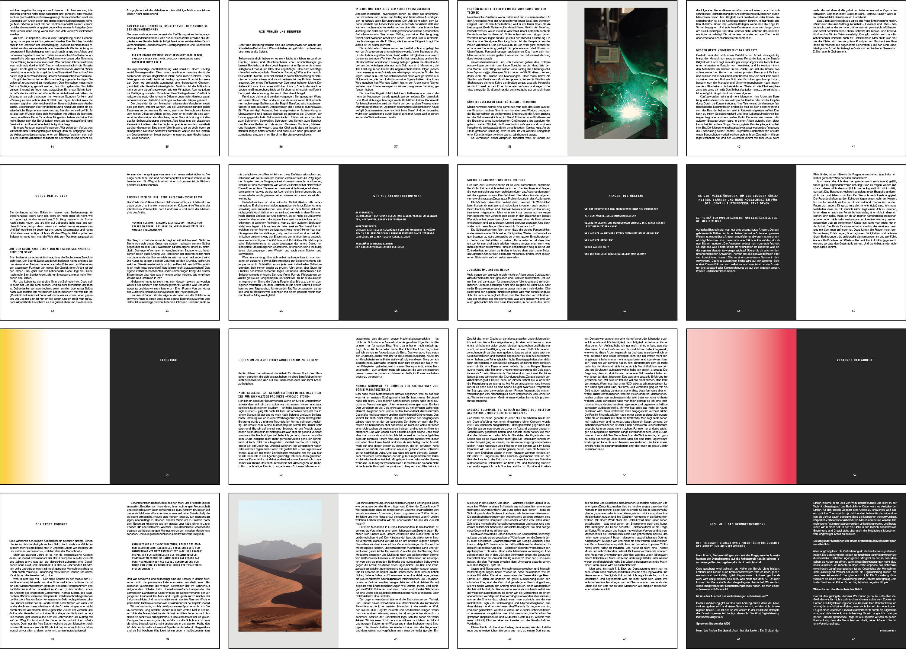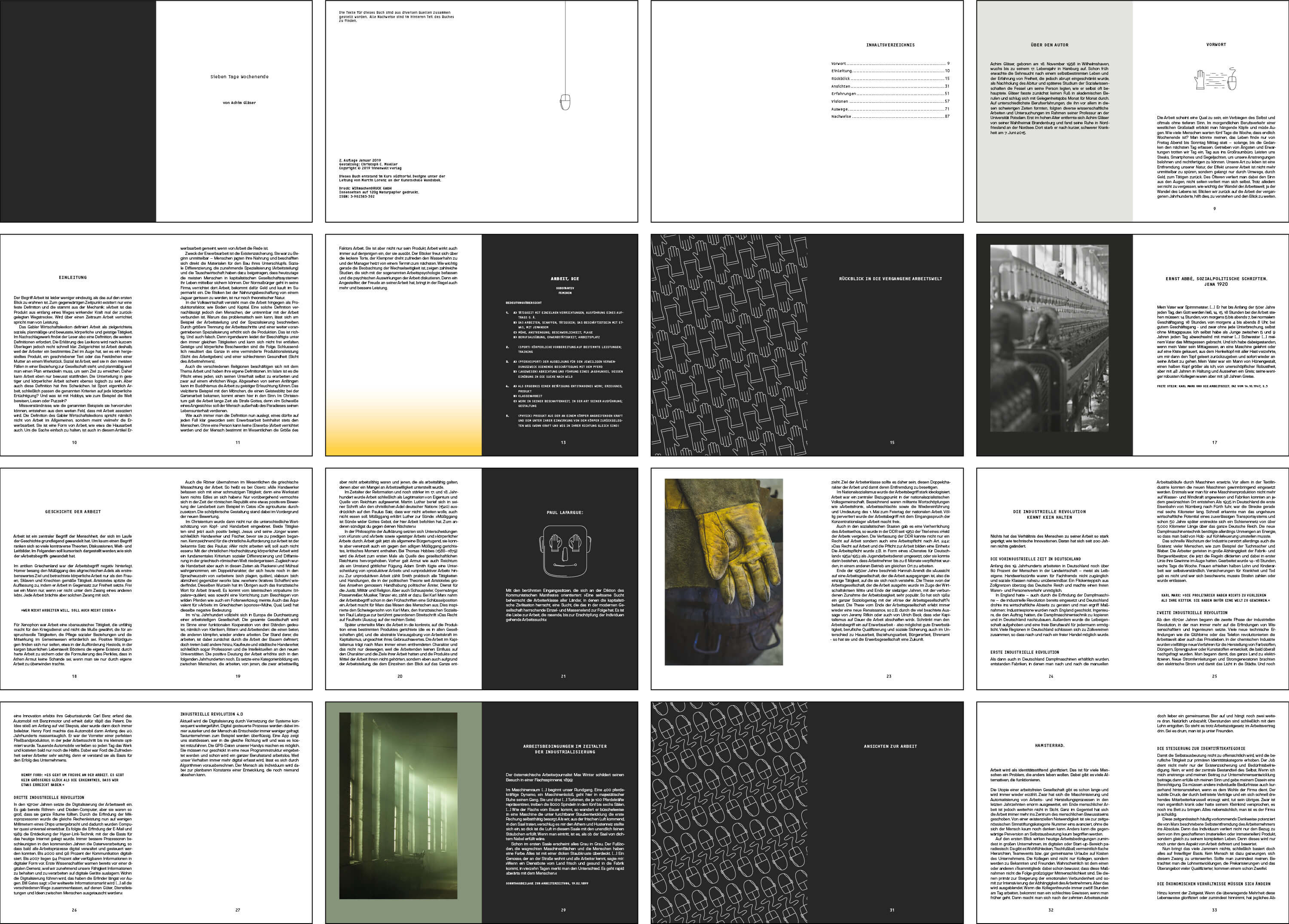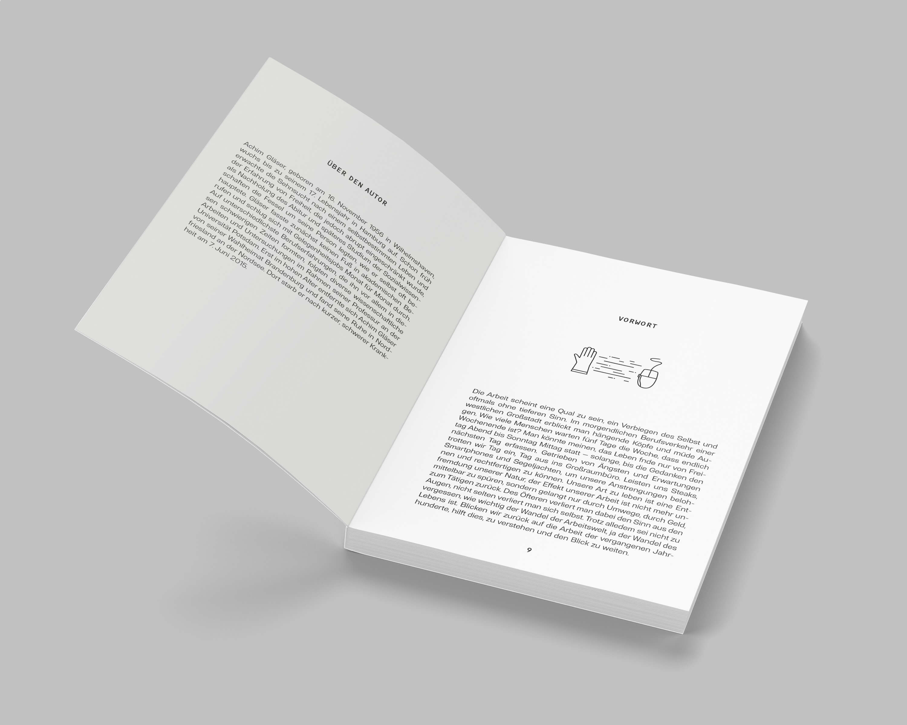 "Die Arbeit scheint eine Qual zu sein, ein Verbiegen des Selbst und oftmals ohne tieferen Sinn. Im morgendlichen Berufsverkehr einer westlichen Großstadt erblickt man hängende Köpfe und müde Augen. Wie viele Menschen warten fünf Tage die Woche, dass endlich Wochenende ist? Man könnte meinen, das Leben finde nur von Freitag Abend bis Sonntag Mittag statt – solange, bis die Gedanken den nächsten Tag erfassen." […]